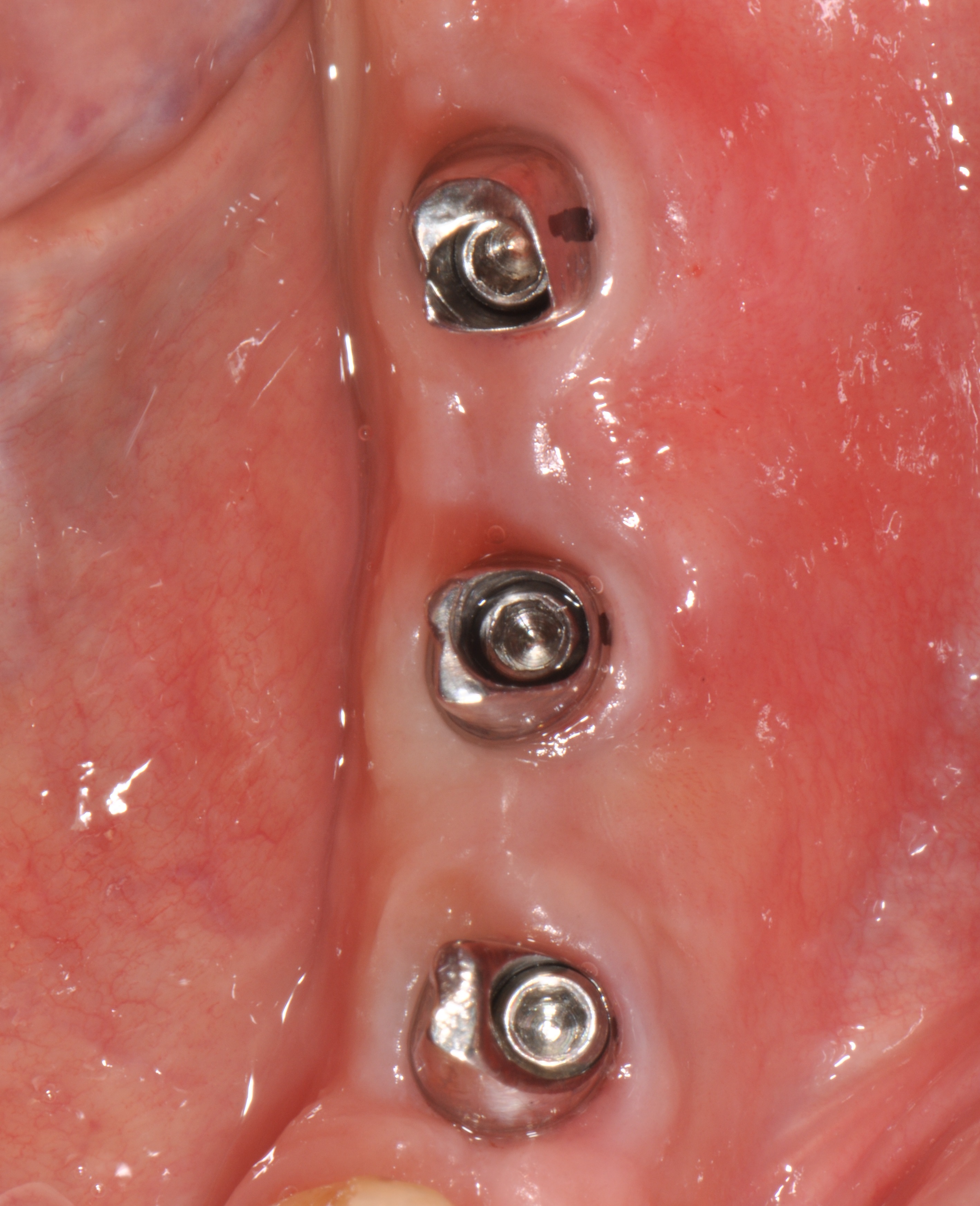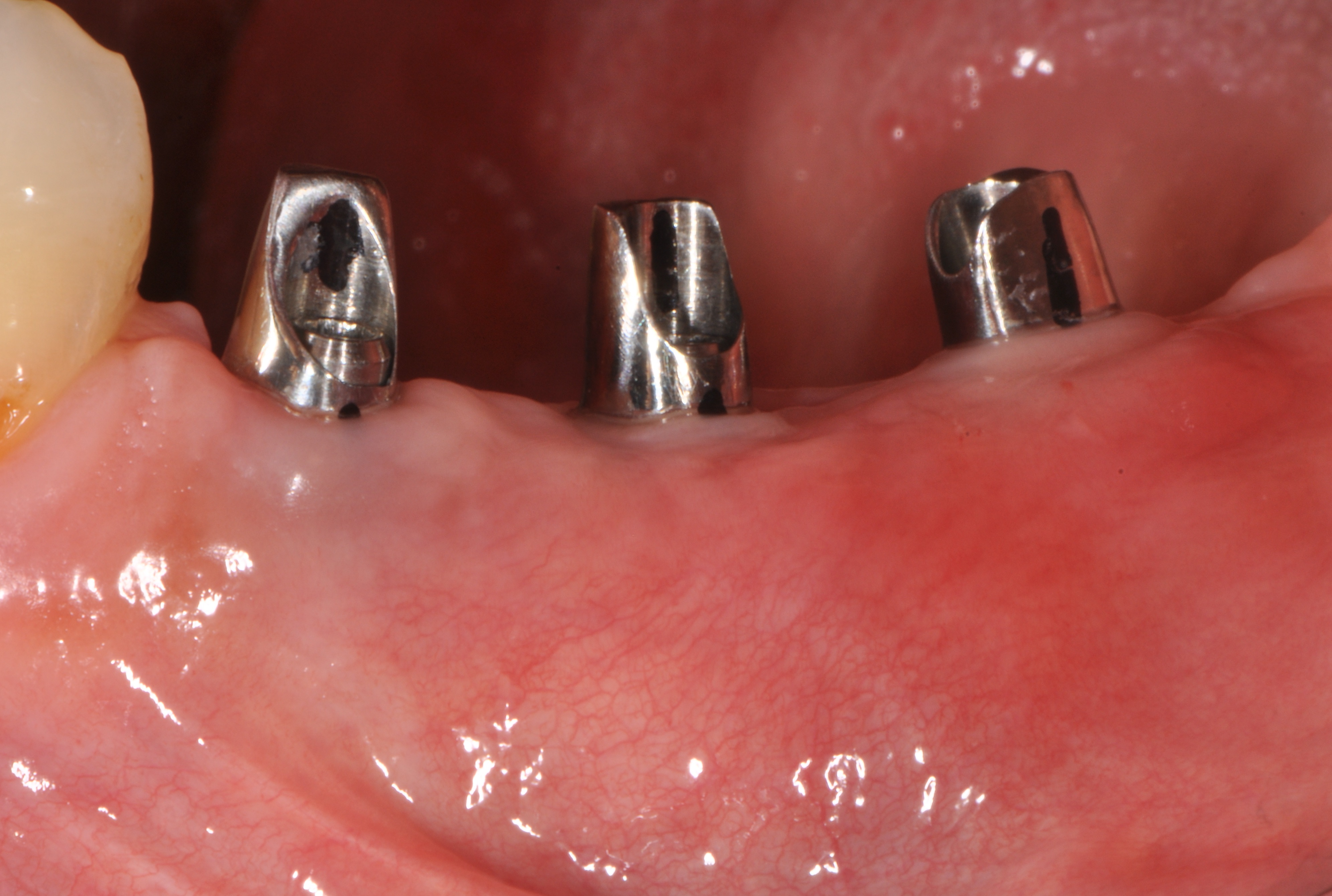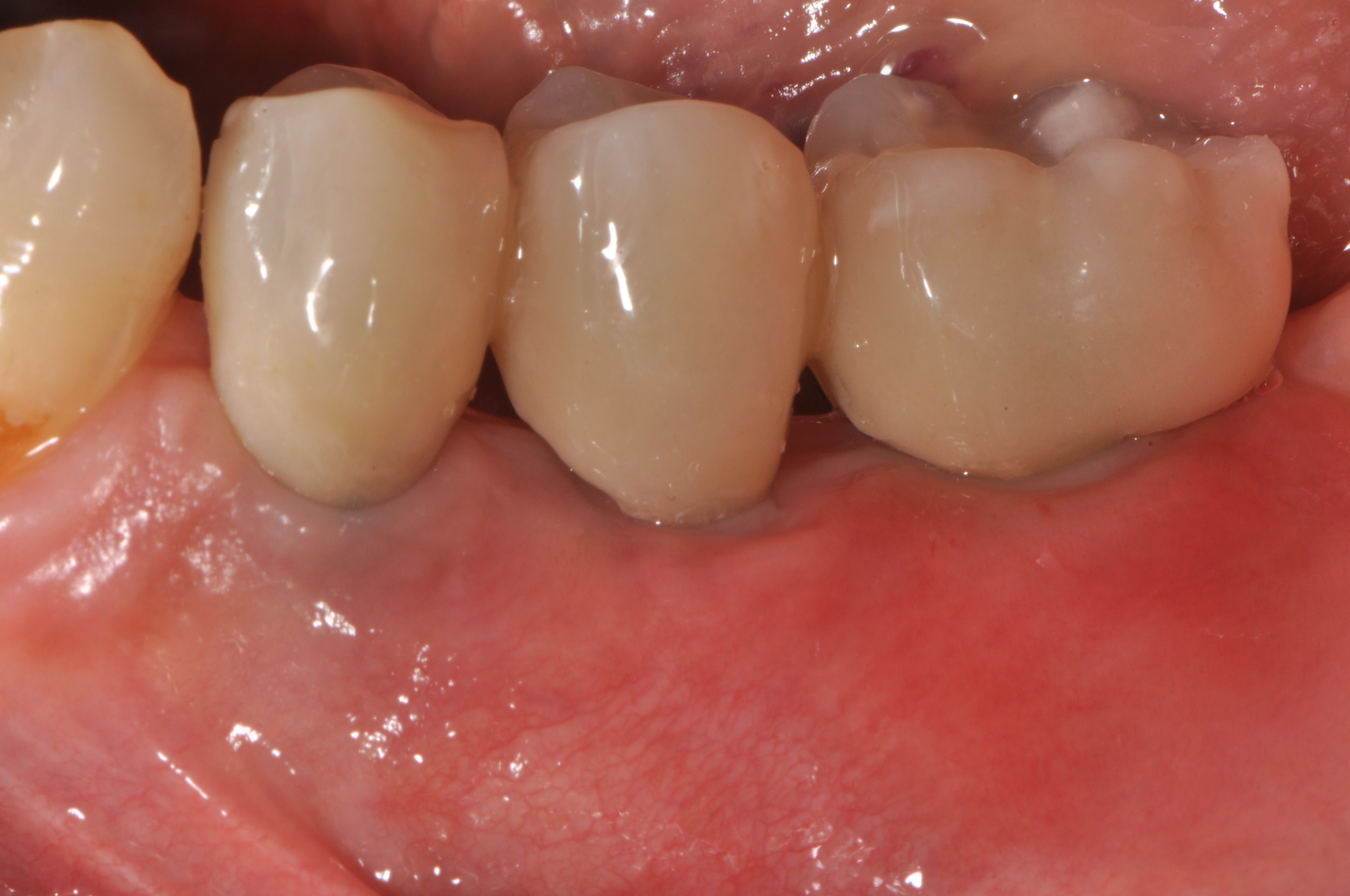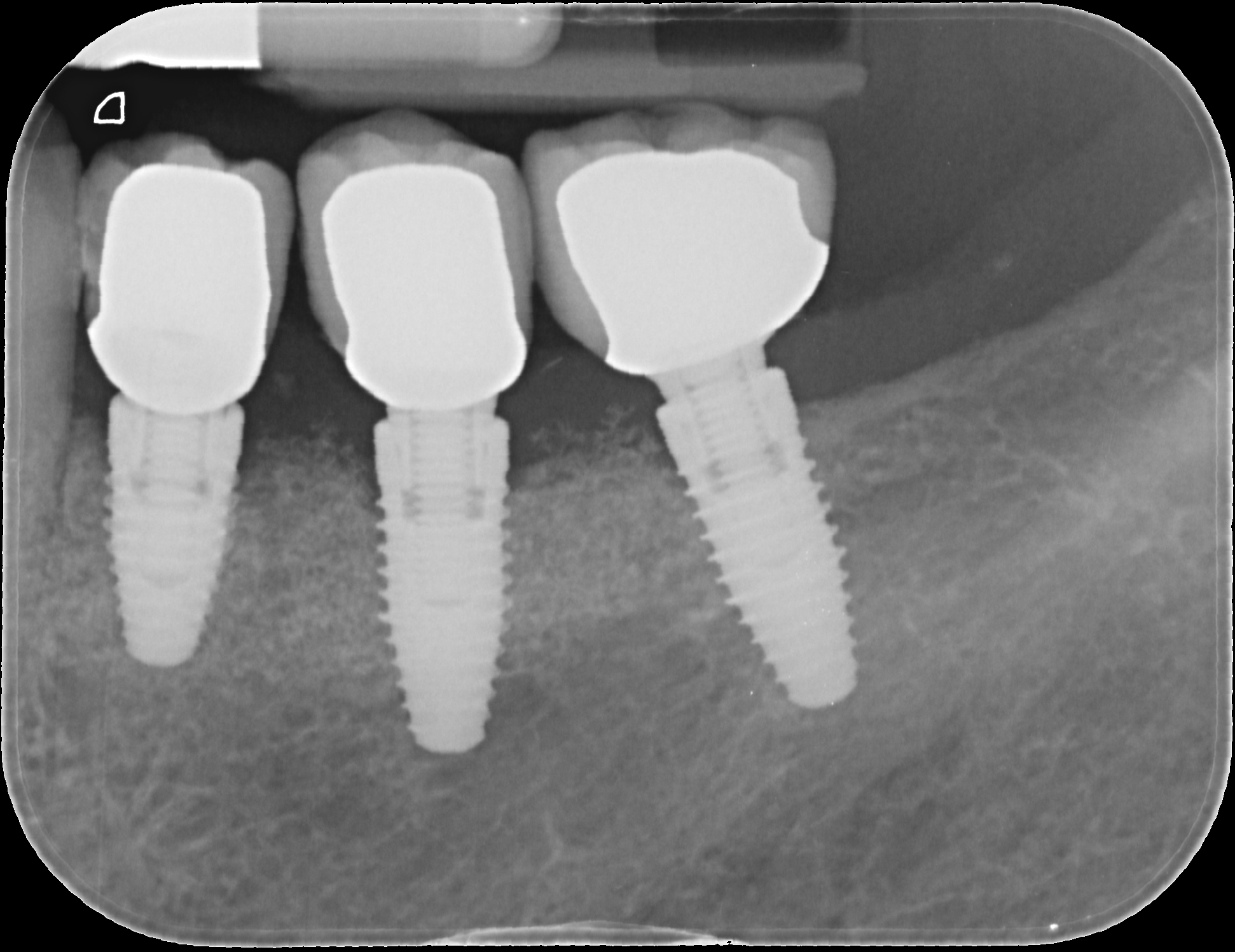 A 52-year-old patient is a referral and has been wearing an immediate provisional partial denture after replacement of her worn and fractured fixed partial denture. As a definitive treatment solution, the patient desired "beautiful and long-lasting" implant-supported single crowns. Clinically the CT-scan revealed a very narrow bone crest ("knife-edge") in the 3rd quadrant. Implant placement has been planned with a simultaneous GBR procedure.