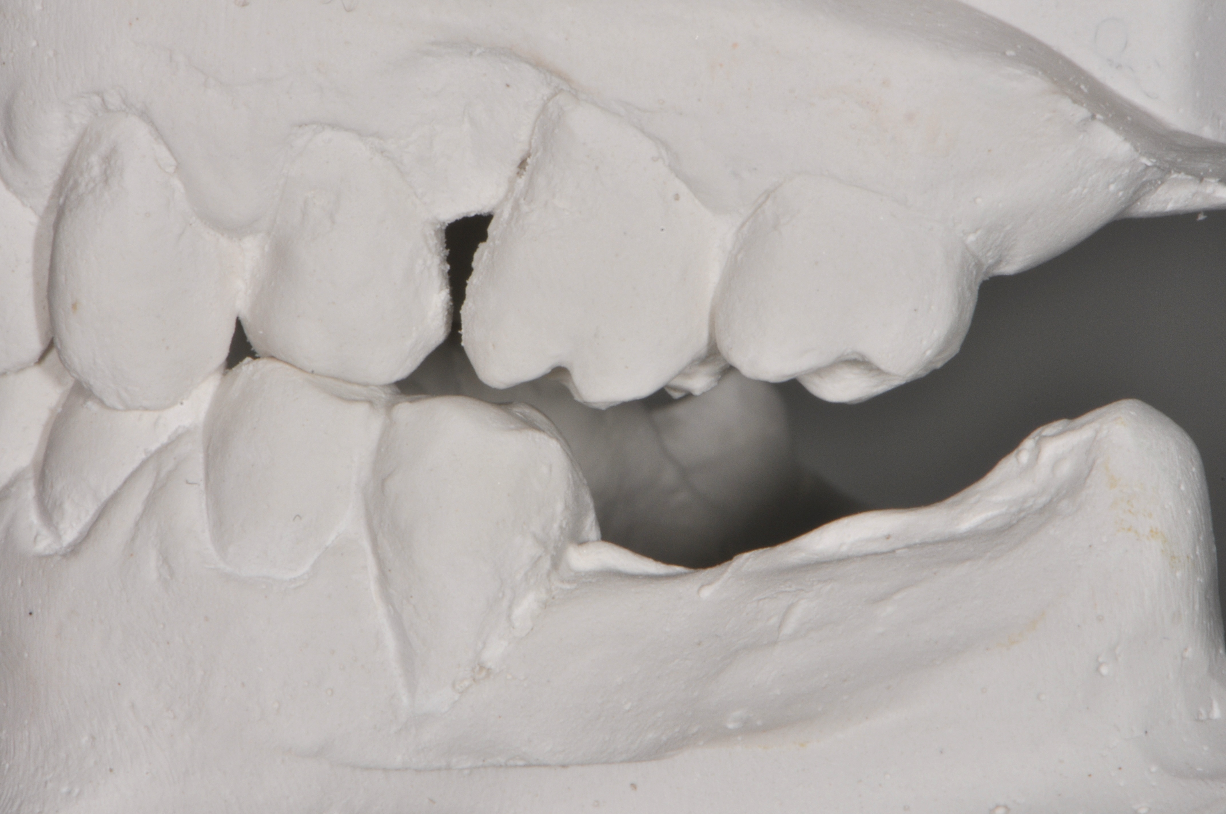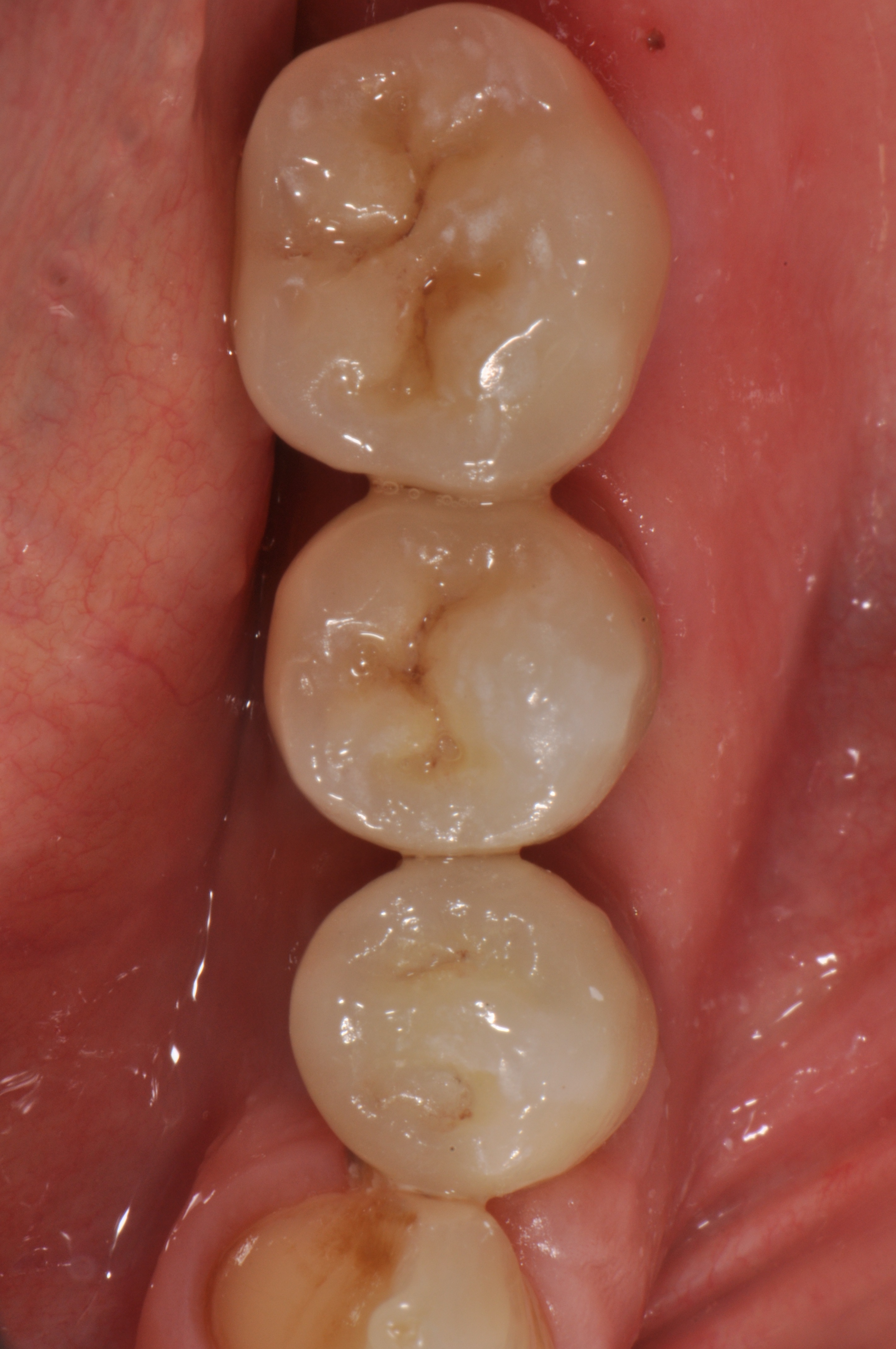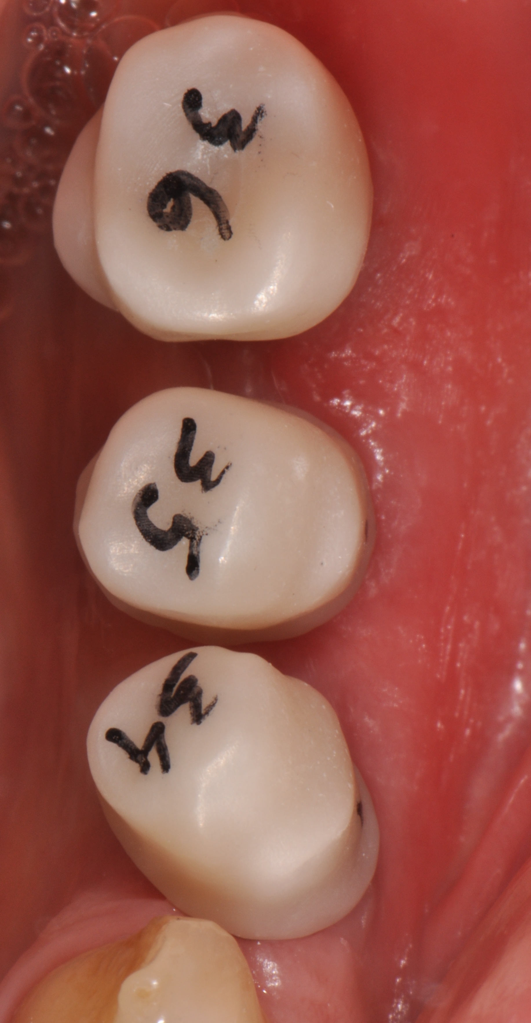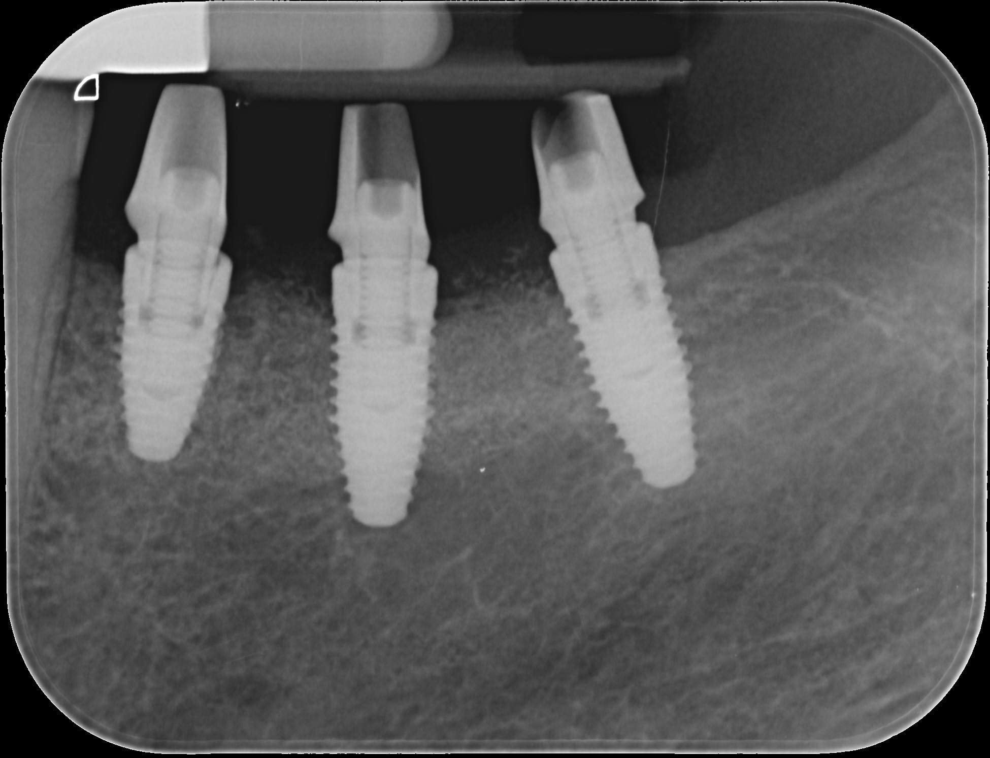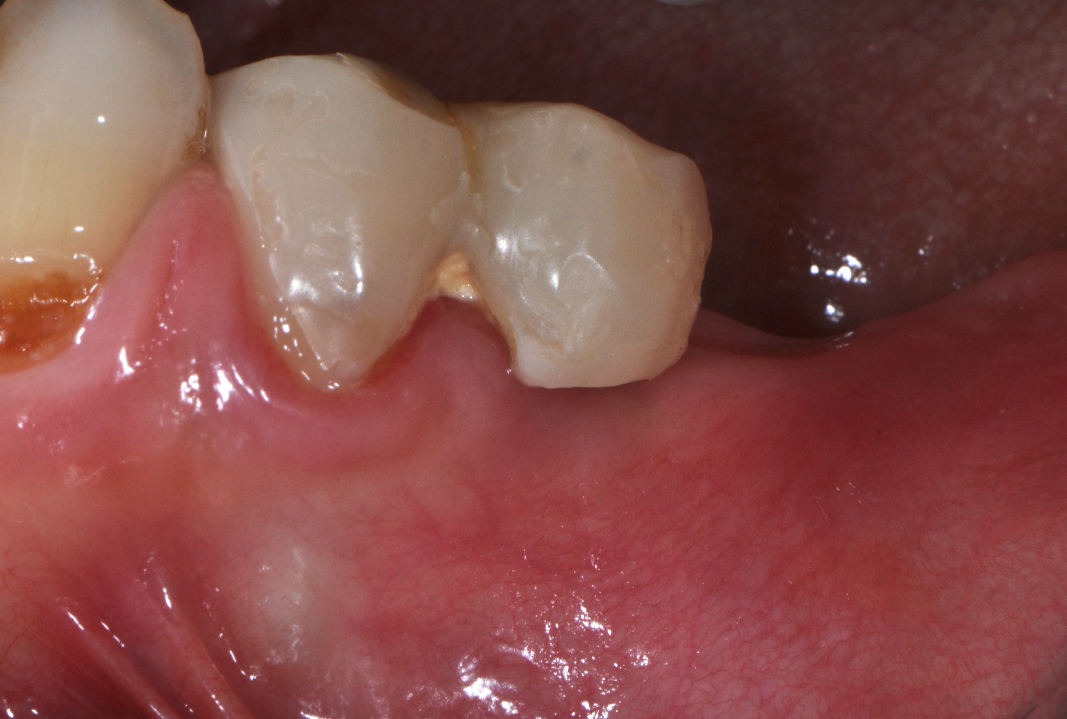 A 52-year-old patient is a referral and has been wearing an immediate provisional partial denture after replacement of her worn and fractured fixed partial denture. As a definitive treatment solution, the patient desired "beautiful and long-lasting" implant-supported single crowns. Clinically the CT-scan revealed a very narrow bone crest ("knife-edge") in the 3rd quadrant. Implant placement has been planned with a simultaneous GBR procedure.